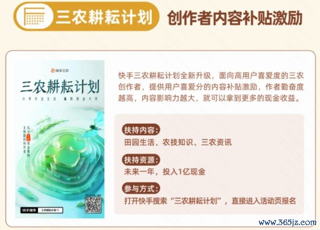 如,快手升级了三农耕耘计划,将投入1亿现金扶持田园生活、农技知识、三农资讯等内容,面向高用户喜爱度的三农作者,按照喜爱度分成提供内容补贴奖励。对于在快手销售农资商品的商家型作者,快手还提供额外的平台优惠补贴政策。