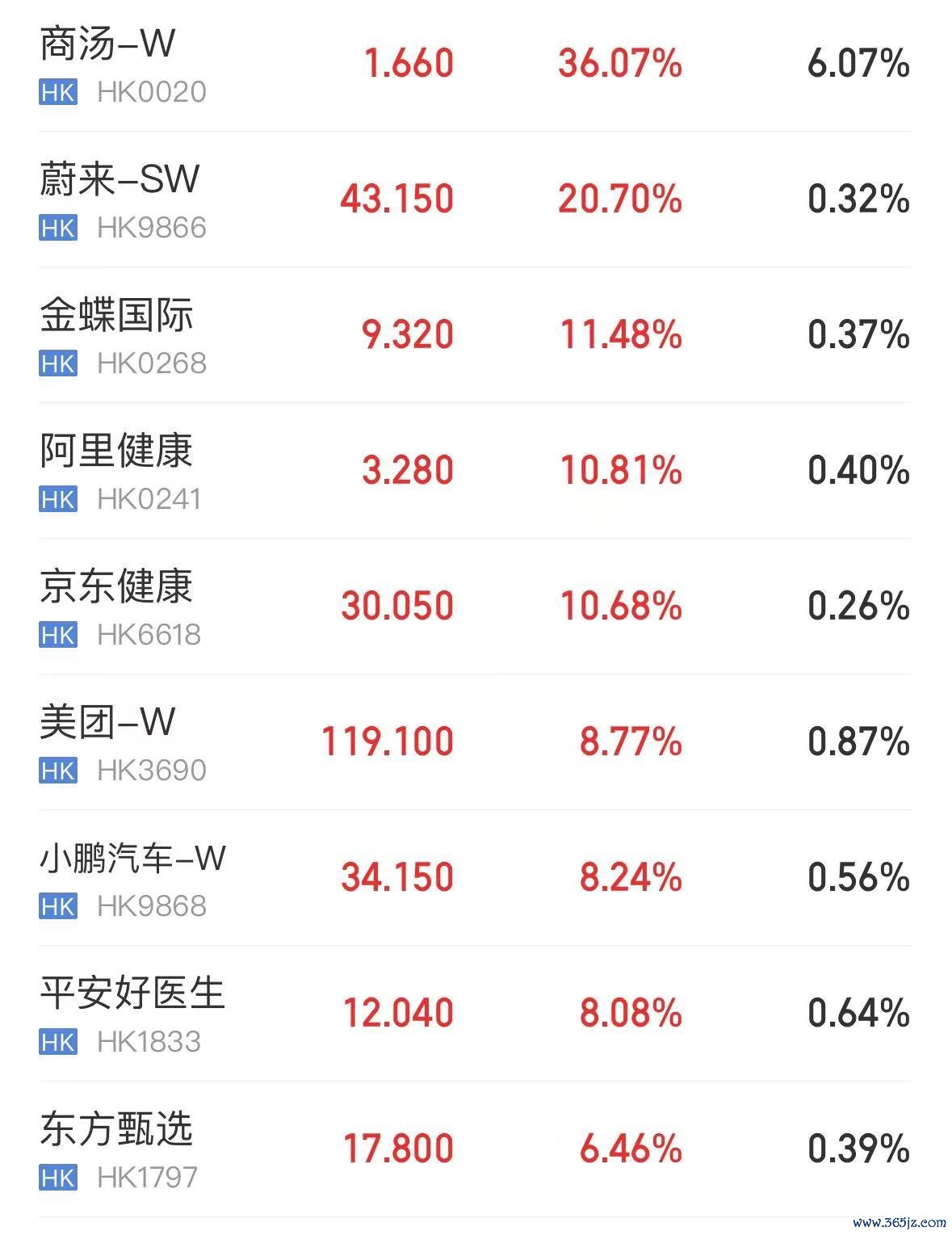 其中,商汤大涨超36%,蔚来涨超20%,万科企业涨超10%,阿里健康涨超10%。